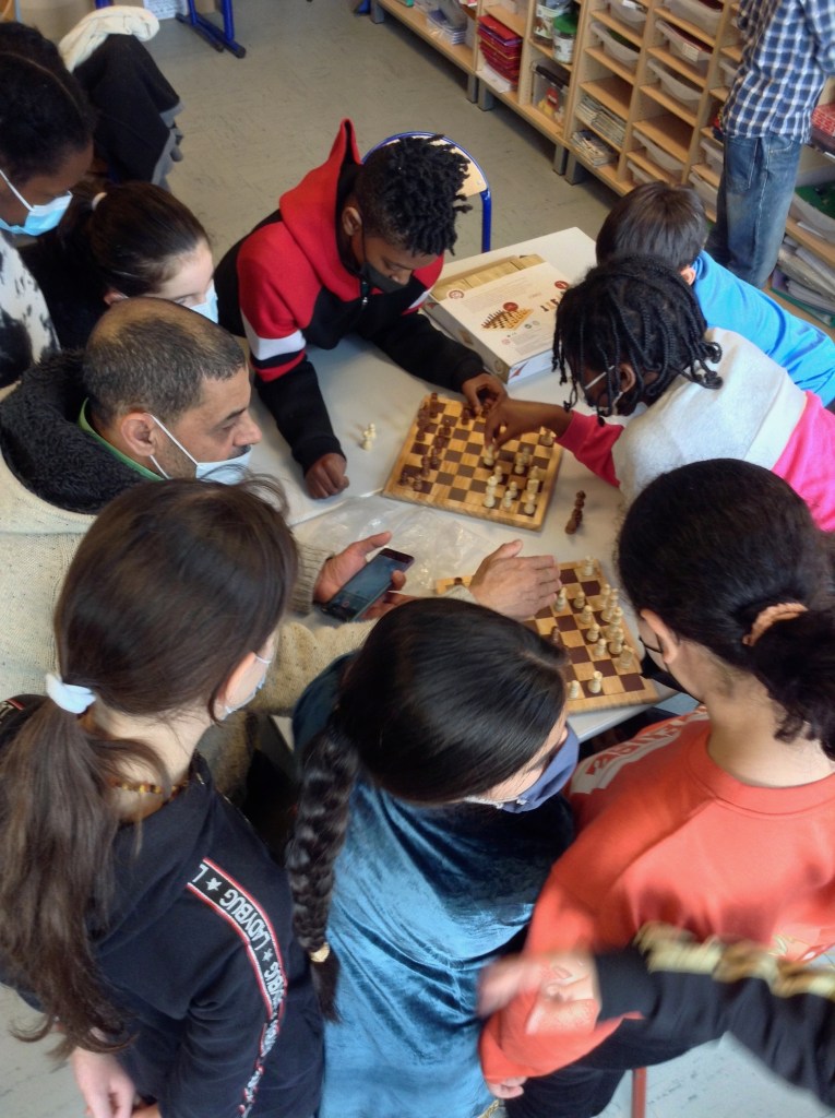 Il a accepté de jouer une partie d’échecs contre quelques élèves. Ce jeu est une véritable passion pour lui. Il anime des ateliers dans le quartier le jeudi de 15h30 à 17h30 à la Cohue.