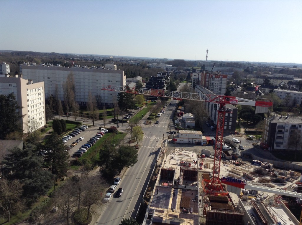 Nous étions sur une sorte de terrasse qui fait le tour de l’immeuble avec un muret d’environ 1m. Il y a plus de traces de pigeons que de vie humaine. Sur le toit, nous avons remarqué une cage avec des pigeons justement. Elle sert à les attraper car ils sont trop nombreux en ville. Ils sont ensuite relâchés à la campagne. Du haut de la tour, nous avons une vue d’ensemble à 360°. On peut voir toute la ville y compris la tour des Horizons, et même plus loin. Tout près, il y a le chantier de la future école Toni Morrison. Il y a aussi des grues, signe que les travaux sont nombreux dans le quartier de Maurepas : rénovations, nouveaux logements et nouveaux commerces sont au programme.