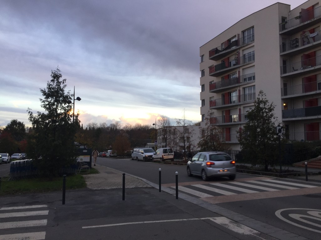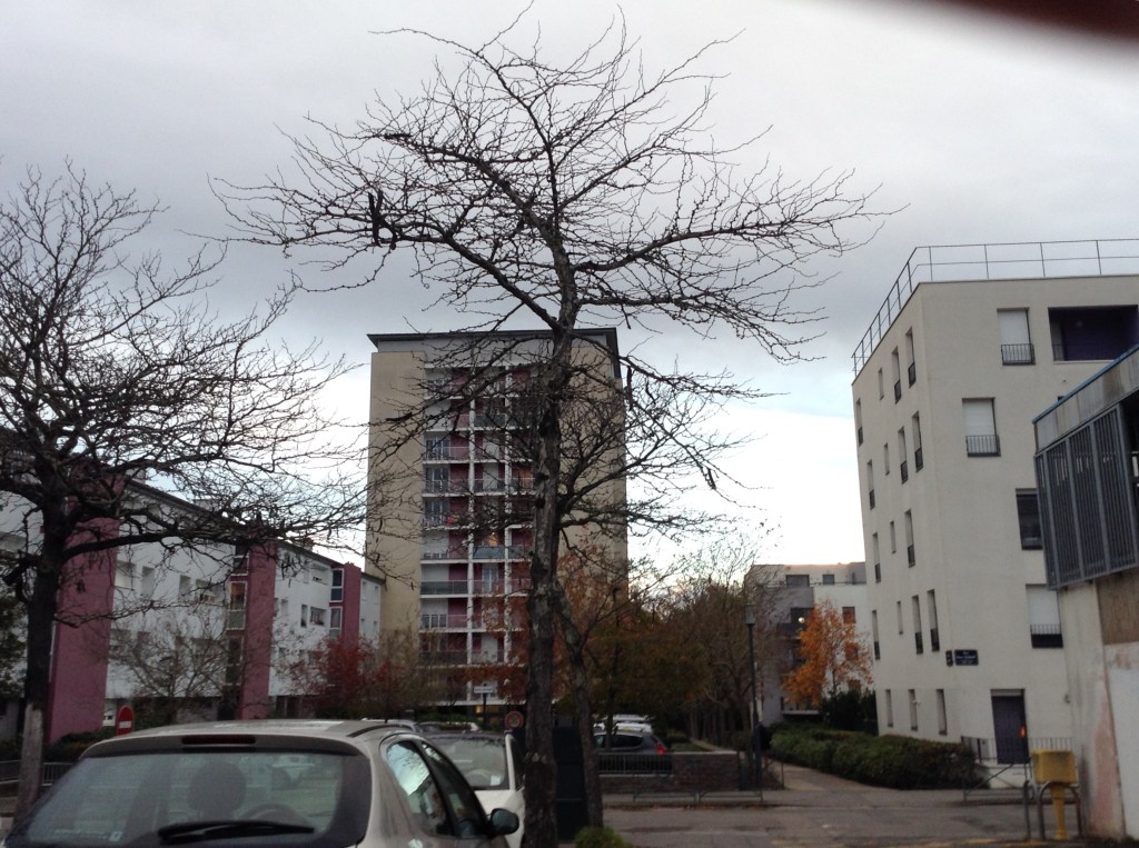 Entre l’école des Gantelles et le centre commercial du Gast-Gayeulles, on voit des immeubles et autres logements. Les arbres ont perdu leurs feuilles car nous sommes en hiver.