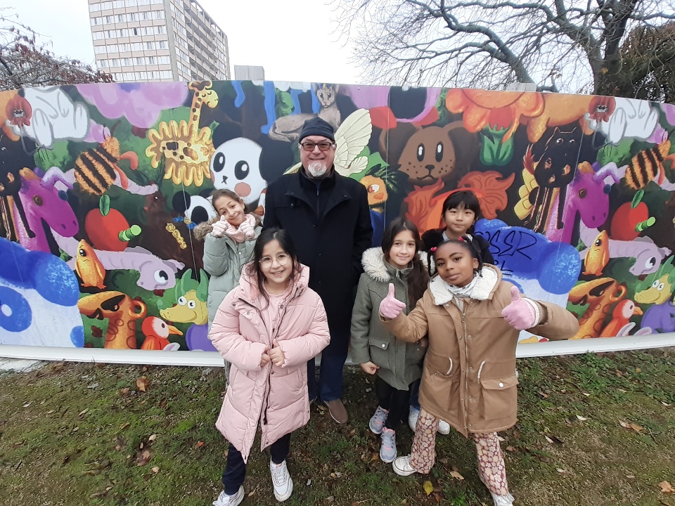 Pascal et le groupe d’élèves qui lui a posé des questions sur l’histoire du quartier.