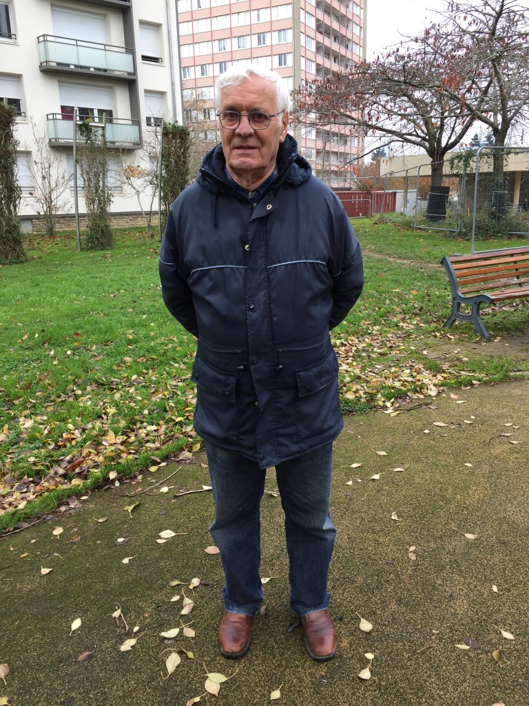 Rémy Poirier a 81 ans. Derrière lui se trouve l’immeuble où il habite depuis plus de 50 ans. Il est originaire de la Sarthe.