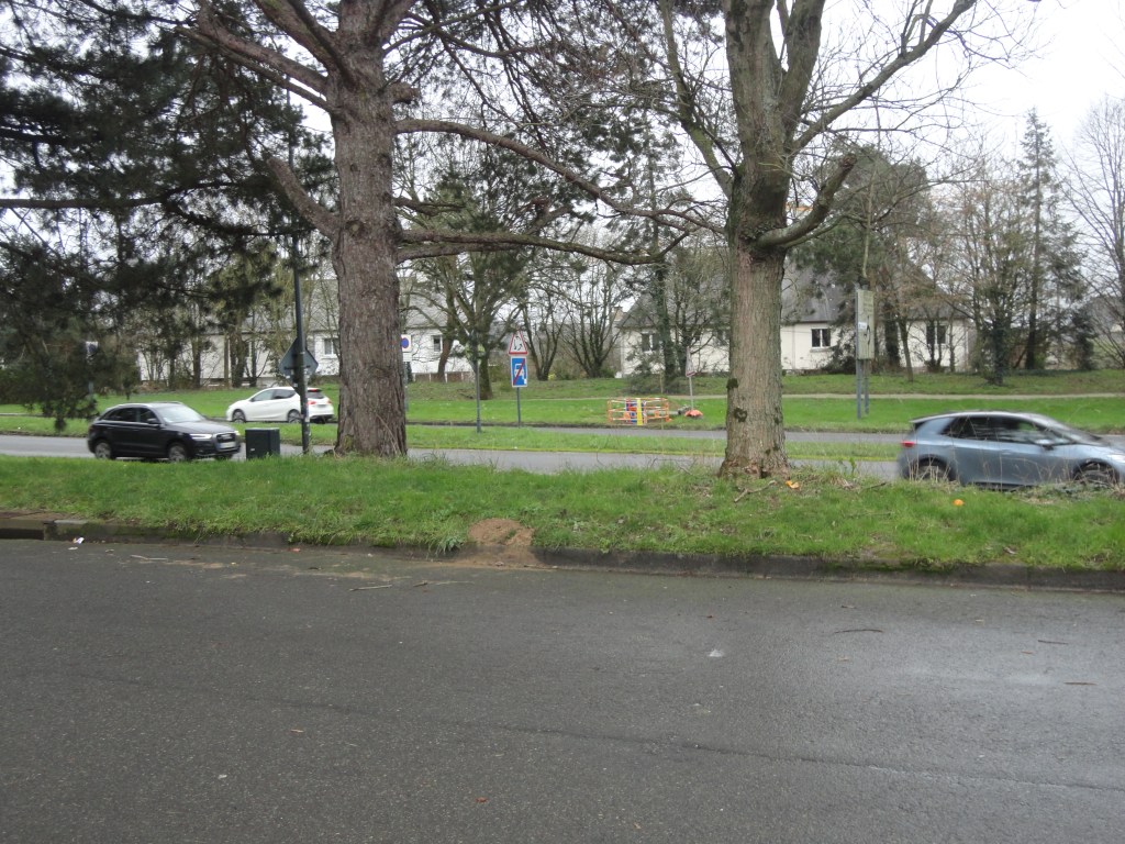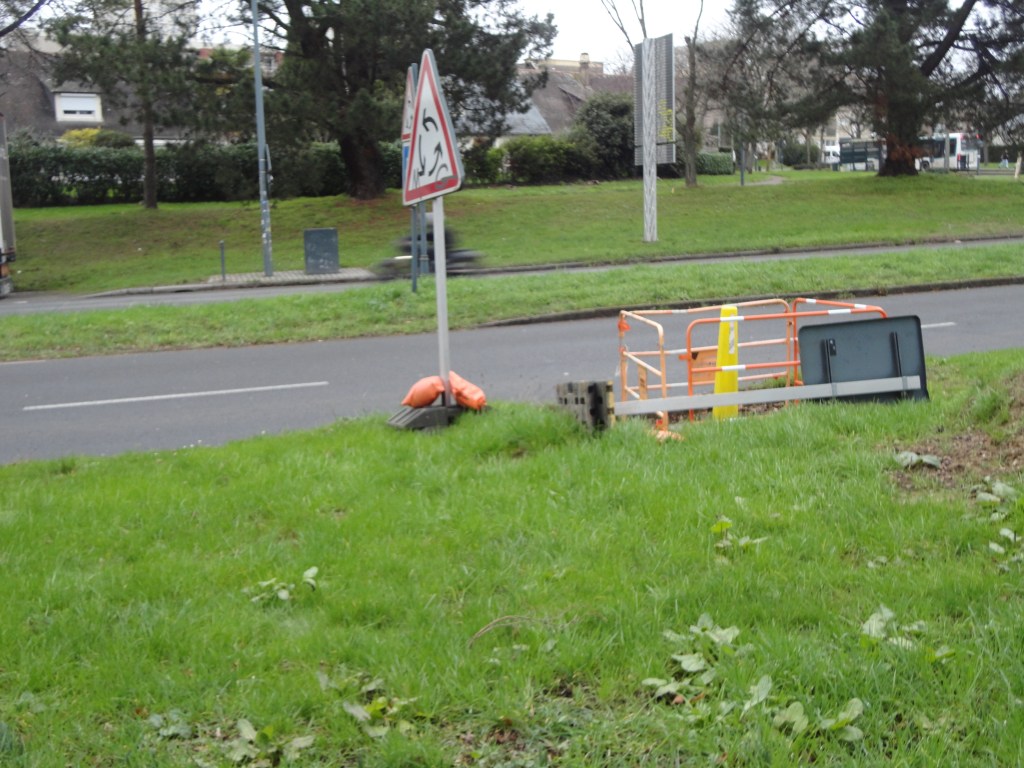 A l’entrée de Rennes, sur la fin de la nationale 1012, juste avant le rond-point amenant à la rue de Saint-Brieuc, des travaux sont en cours. Un panneau de signalisation tombé est sur le point d’être remplacé.