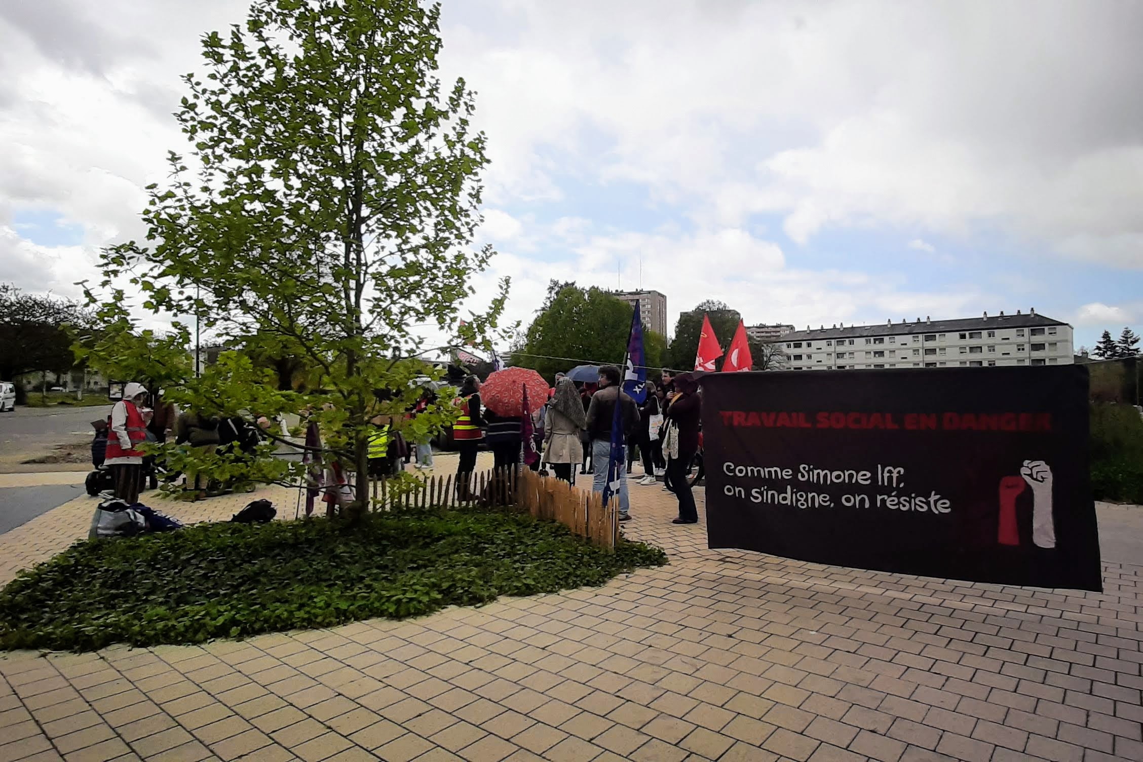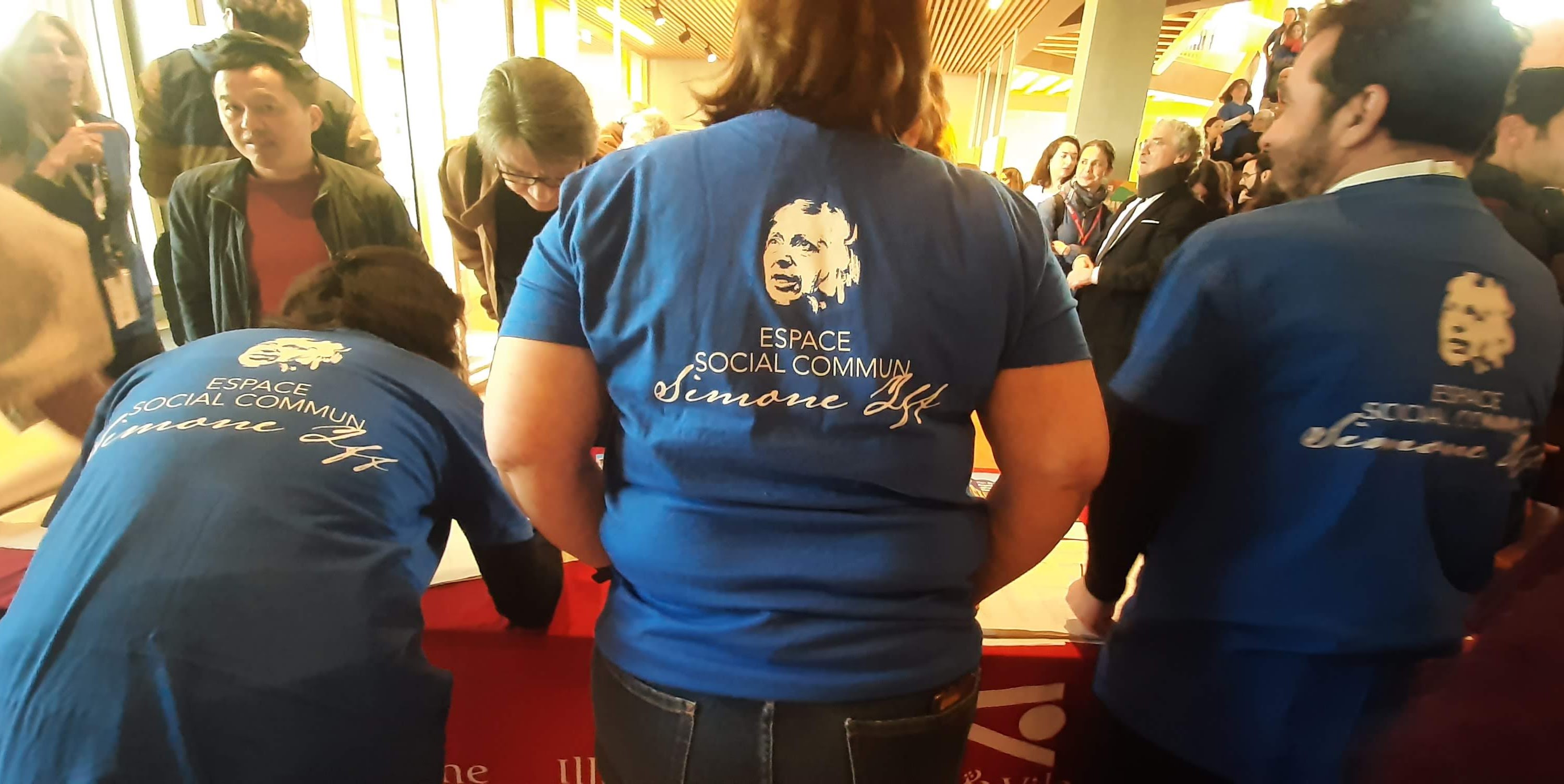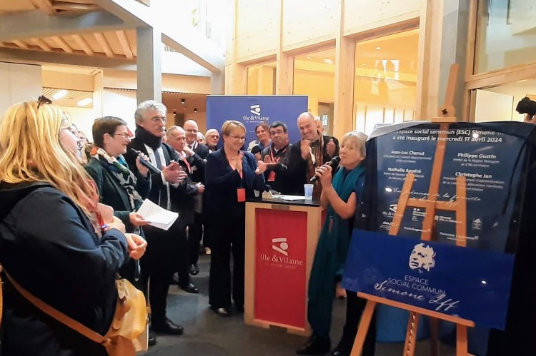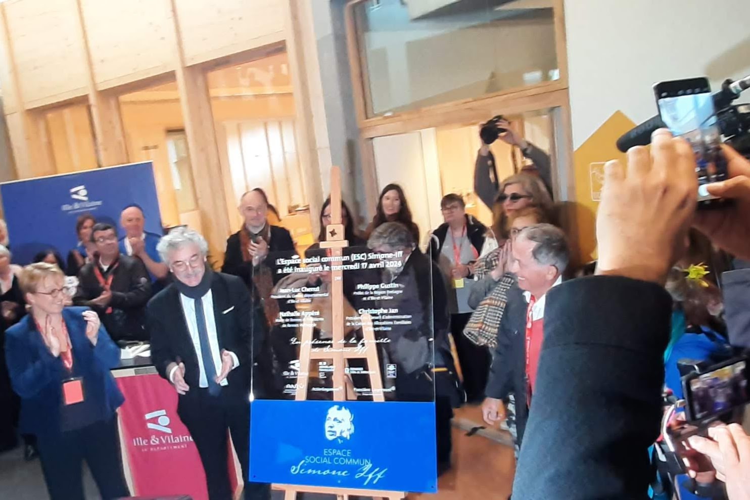Nathalie Appéré (maire de Rennes) et Jean-Luc Chenu (Président du département d’Ille-et-Vilaine) écoutent avec émotion les mots de l’une des filles de Simone Iff. Elle évoque le souvenir de sa maman, fervente militante de la liberté de disposer de son corps pour les femmes.Nathalie Appéré et Jean-Luc Chenu dévoile la plaque de l’inauguration de l’Espace Social Commun Simone Iff, en compagnie de l’un des fils de Simone Iff, première présidente du Mouvement français du planning familial de 1973 à 1981. Quelques minutes plus tard, ce dernier a fait don d’une aquarelle réalisée par Simone Iff.Dès 10h30, le public était accueilli pour l’inauguration de l’Espace Social Commun Simone Iff, un lieu multiservices publics de 6 000 m².Yves-Marie Le Scornet, directeur du Centre social de Maurepas, anime l’un des quatre groupes pour la visite guidée des locaux. Ils ont été financés par le Département d’Ille-et-Vilaine (9,5 millions d’euros), la ville de Rennes (3,2 millions d’euros), l’État à travers l’Agence nationale pour la rénovation urbaine (2,9 millions d’euros), Rennes métropole (1,2 million d’euros) et la Caisse d’allocations familiales (300 000 euros).Terrasse du 5e étage de l’Espace social commun Simone Iff réservée pour les quelques 120 personnes qui travaillent dans les locaux depuis février 2024.Découverte des locaux du CDAS au 2e étage de l’ESC Simone Iff.Officiels, acteurs du quartier, habitants… Un public nombreux a souhaité être présent à l’inauguration de l’ESC Simone Iff et découvrir le chêne qui sera planté à proximité pour rappeler que la Place du Gros-Chêne, ancien lieu de l’ESC, reste dans l’ADN du nouvel équipement et de ces acteurs.Le personnel de l’ESC Simone Iff a improvisé une chorégraphie surprise, joyeuse et entrainante.L’ensemble du personnel de l’Espace social commun portait un tee-shirt bleu avec le portrait de Simone Iff.Le cocktail de l’inauguration de l’ESC Simone Iff a été réalisé par le restaurant coopératif « Pépites! », situé au 204 avenue Patton à Rennes, en contre-bas de la place du Gros-Chêne.Les préparations culinaires de « Pépites! » ont ravi les papilles du public présent à l’inauguration.A l’extérieur, en face de l’ESC Simone Iff, des syndicats finissent de manifester. L’inauguration de l’ESC est l’occasion de lancer une alerte rouge sur l’avenir de l’action social et le médico-social à Rennes et en Ille-et-Vilaine.