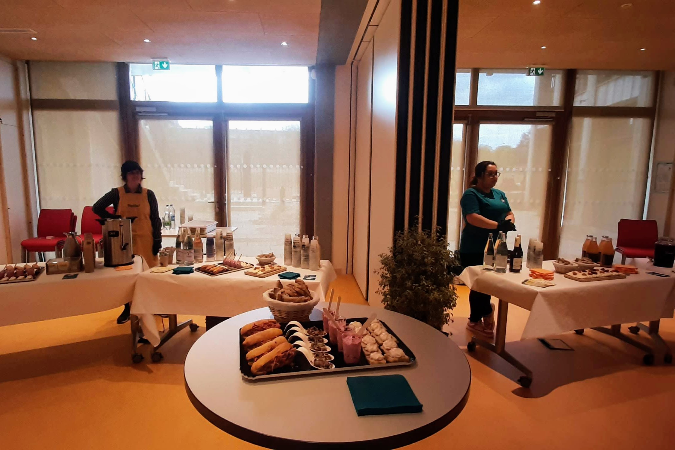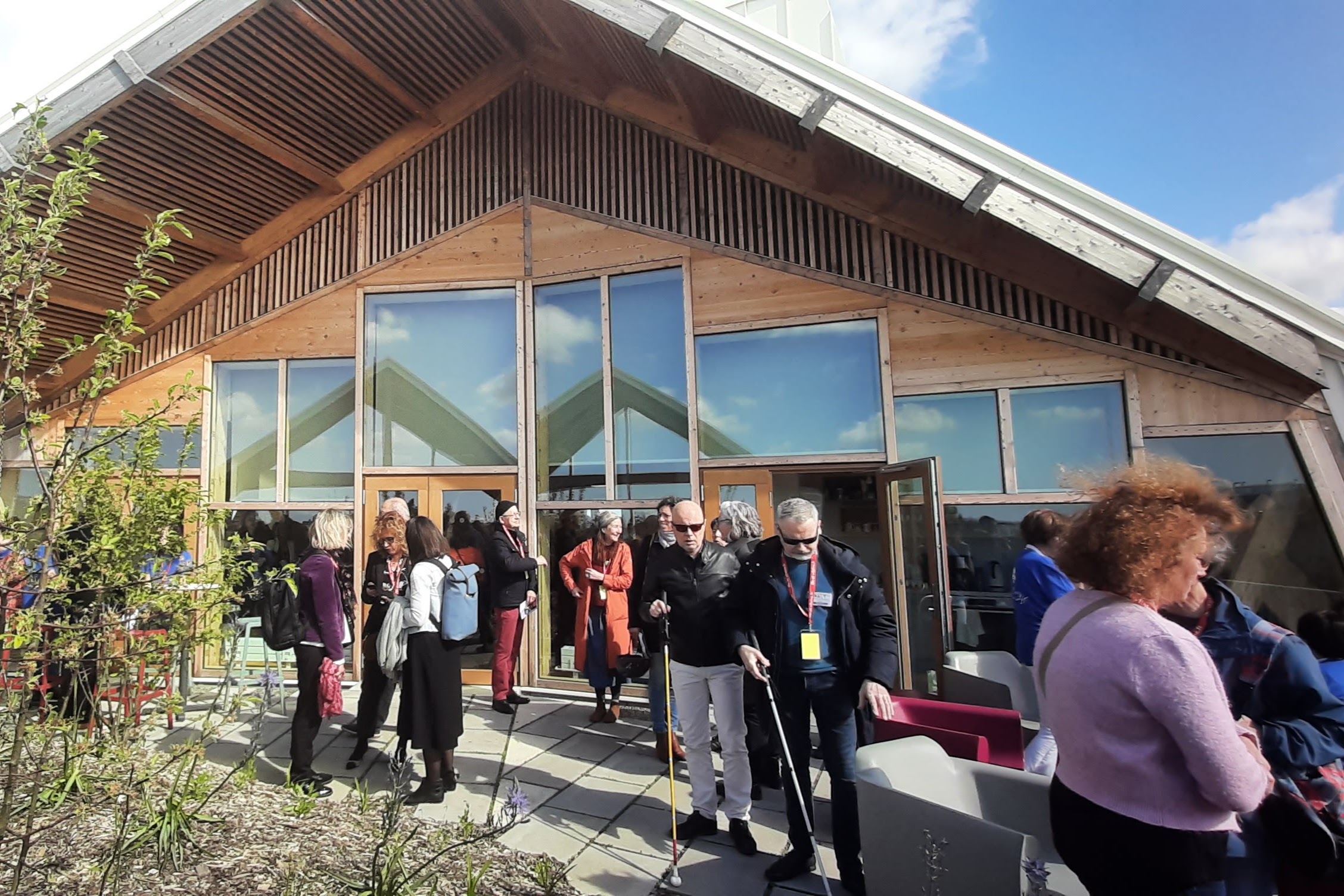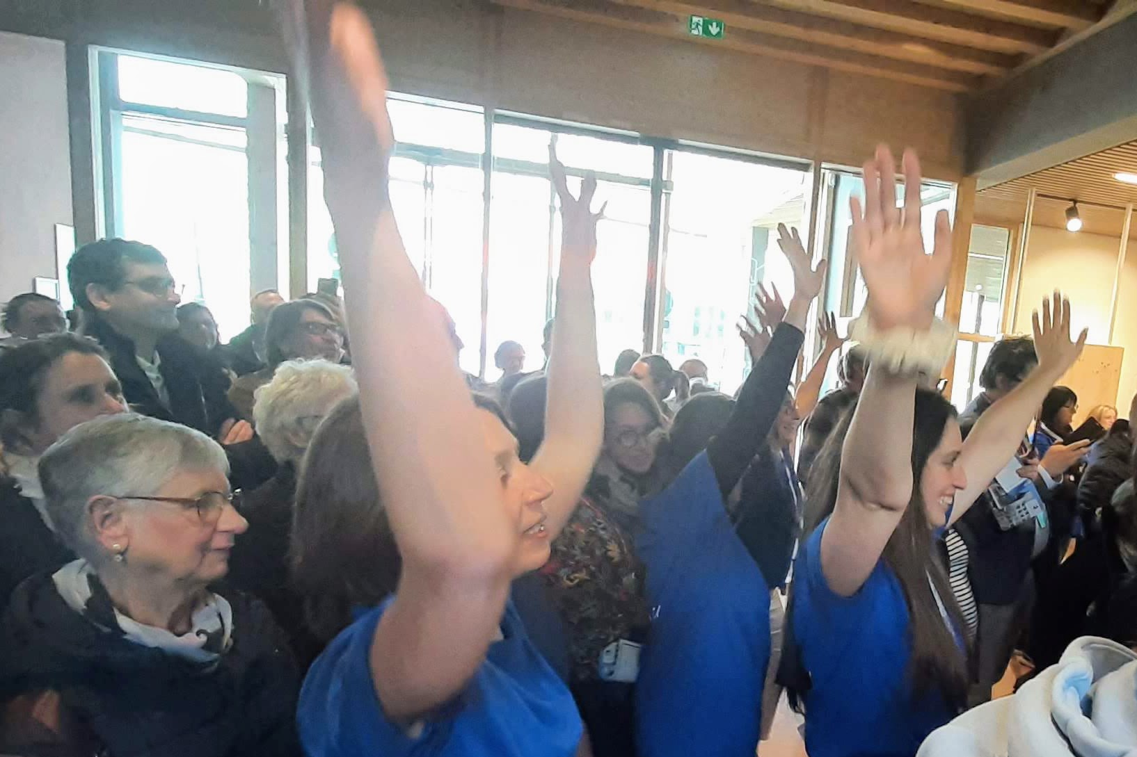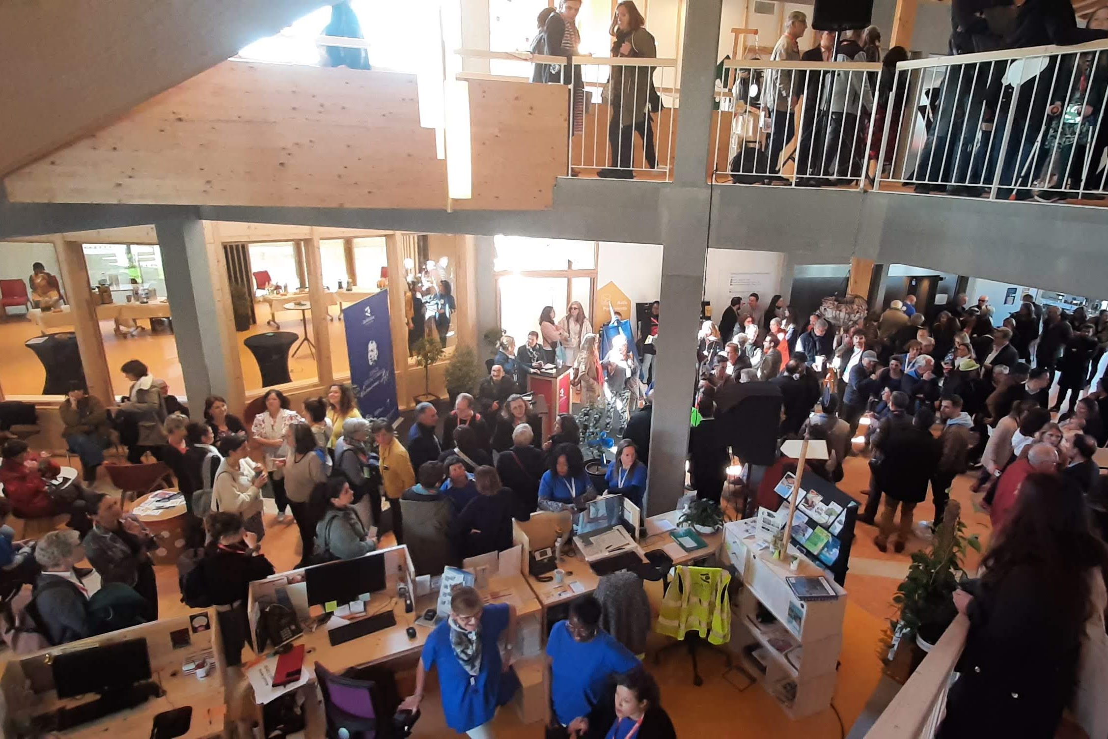 Nathalie Appéré (maire de Rennes) et Jean-Luc Chenu (Président du département d’Ille-et-Vilaine) écoutent avec émotion les mots de l’une des filles de Simone Iff. Elle évoque le souvenir de sa maman, fervente militante de la liberté de disposer de son corps pour les femmes.Nathalie Appéré et Jean-Luc Chenu dévoile la plaque de l’inauguration de l’Espace Social Commun Simone Iff, en compagnie de l’un des fils de Simone Iff, première présidente du Mouvement français du planning familial de 1973 à 1981. Quelques minutes plus tard, ce dernier a fait don d’une aquarelle réalisée par Simone Iff.Dès 10h30, le public était accueilli pour l’inauguration de l’Espace Social Commun Simone Iff, un lieu multiservices publics de 6 000 m².Yves-Marie Le Scornet, directeur du Centre social de Maurepas, anime l’un des quatre groupes pour la visite guidée des locaux. Ils ont été financés par le Département d’Ille-et-Vilaine (9,5 millions d’euros), la ville de Rennes (3,2 millions d’euros), l’État à travers l’Agence nationale pour la rénovation urbaine (2,9 millions d’euros), Rennes métropole (1,2 million d’euros) et la Caisse d’allocations familiales (300 000 euros).Terrasse du 5e étage de l’Espace social commun Simone Iff réservée pour les quelques 120 personnes qui travaillent dans les locaux depuis février 2024.Découverte des locaux du CDAS au 2e étage de l’ESC Simone Iff.Officiels, acteurs du quartier, habitants… Un public nombreux a souhaité être présent à l’inauguration de l’ESC Simone Iff et découvrir le chêne qui sera planté à proximité pour rappeler que la Place du Gros-Chêne, ancien lieu de l’ESC, reste dans l’ADN du nouvel équipement et de ces acteurs.Le personnel de l’ESC Simone Iff a improvisé une chorégraphie surprise, joyeuse et entrainante.L’ensemble du personnel de l’Espace social commun portait un tee-shirt bleu avec le portrait de Simone Iff.Le cocktail de l’inauguration de l’ESC Simone Iff a été réalisé par le restaurant coopératif « Pépites! », situé au 204 avenue Patton à Rennes, en contre-bas de la place du Gros-Chêne.Les préparations culinaires de « Pépites! » ont ravi les papilles du public présent à l’inauguration.A l’extérieur, en face de l’ESC Simone Iff, des syndicats finissent de manifester. L’inauguration de l’ESC est l’occasion de lancer une alerte rouge sur l’avenir de l’action social et le médico-social à Rennes et en Ille-et-Vilaine.