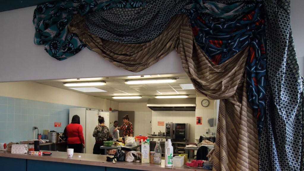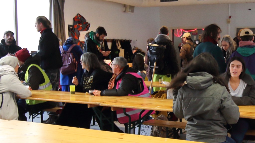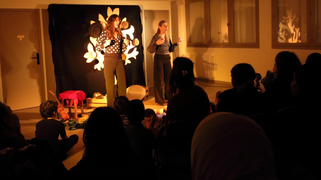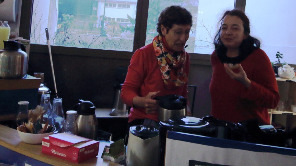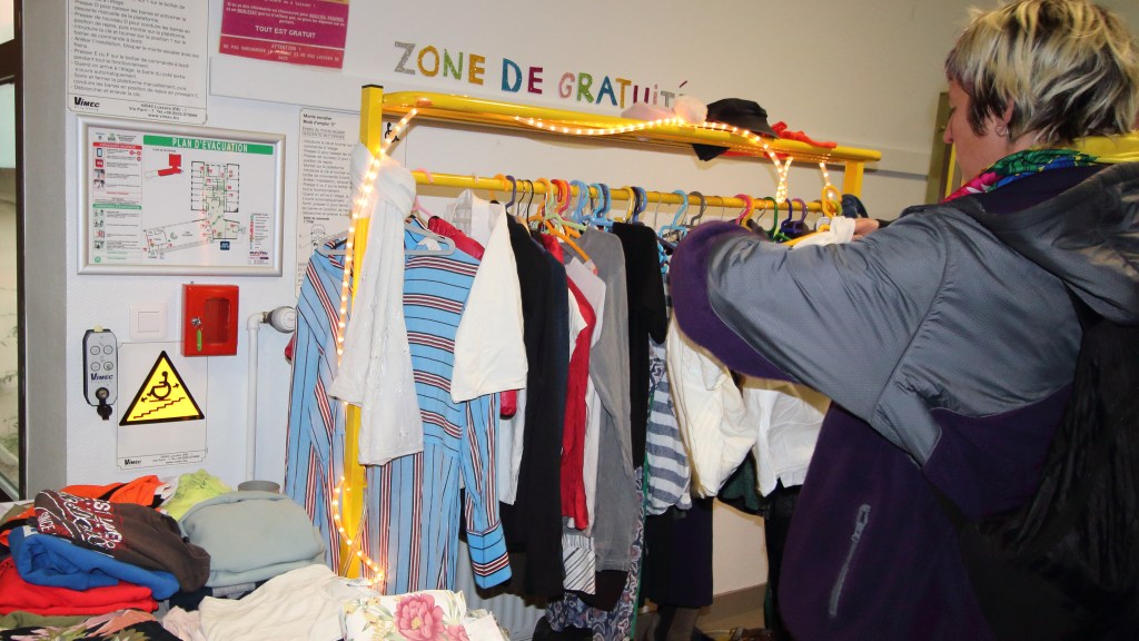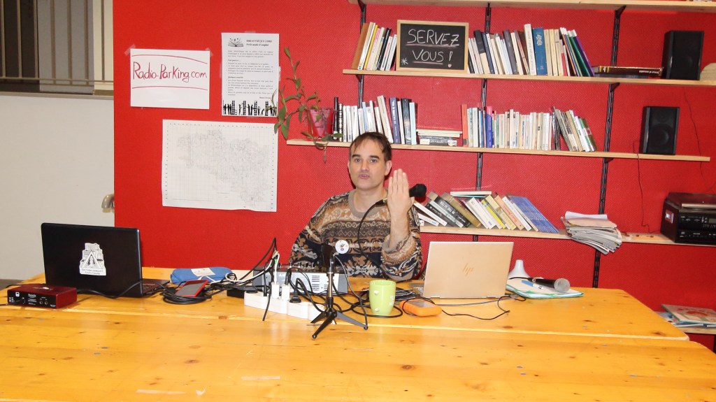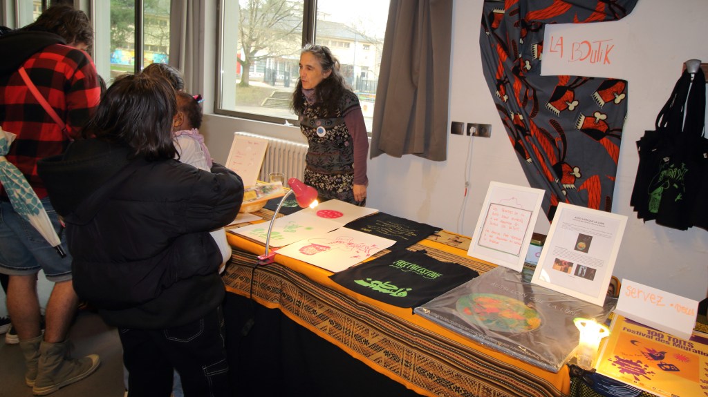 Radio-Parking assure l’animation du hall entre musiques et interviewsExposition photo dans la salle polyvalente du PAMDes bénévoles s’activent en cuisine pour le repas partagé du soirA l’heure du goûter, des gâteaux faits maison sont proposésNicole et Anne servent boissons chaudes et cocktails de fruits au bar proposé par La LoupioteDes tables étaient à disposition du public pour se poser, manger, boire une collation et discuter dans la salle polyvalente du PAMAu 3e étage, Sophie et Marion de la compagnie « Dis Pourquoi » se préparent dans leur logeLe public arrive au 3é étage pour assister au conte musical « Zaïna » joué et changé par Marion et SophieSalle comble pour écouter Sophie et Marion raconter l’histoire de l’exil et l’évolution de Zaïna au fil de son long voyageUne boutique permet repartir avec un souvenir : dessins, sacs…et dezs vêtements. Les bénéfices sont reversés pour une partie aux associations organisatrices du festival et une autre partie une association qui soutient La Palestine.Dans le hall, le public a pu découvrir la zone de gratuité du PAM, où chacun peut repartir avec le vêtement dont il a besoin