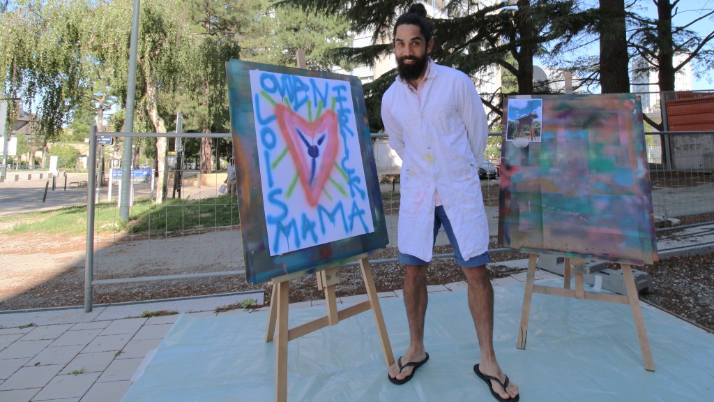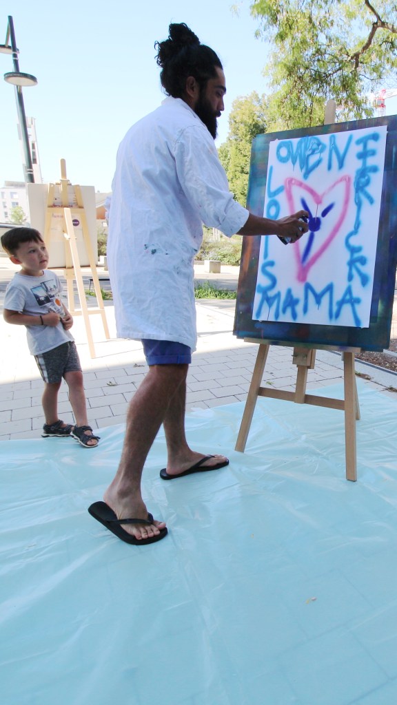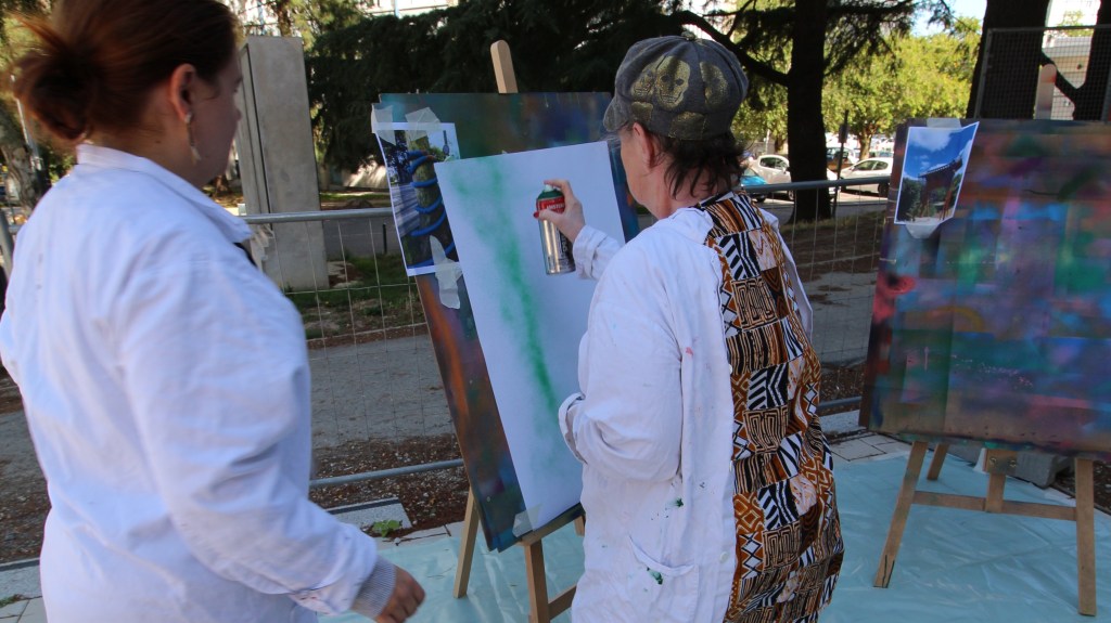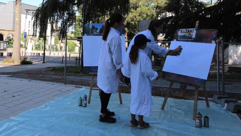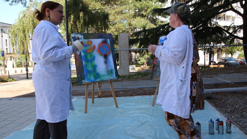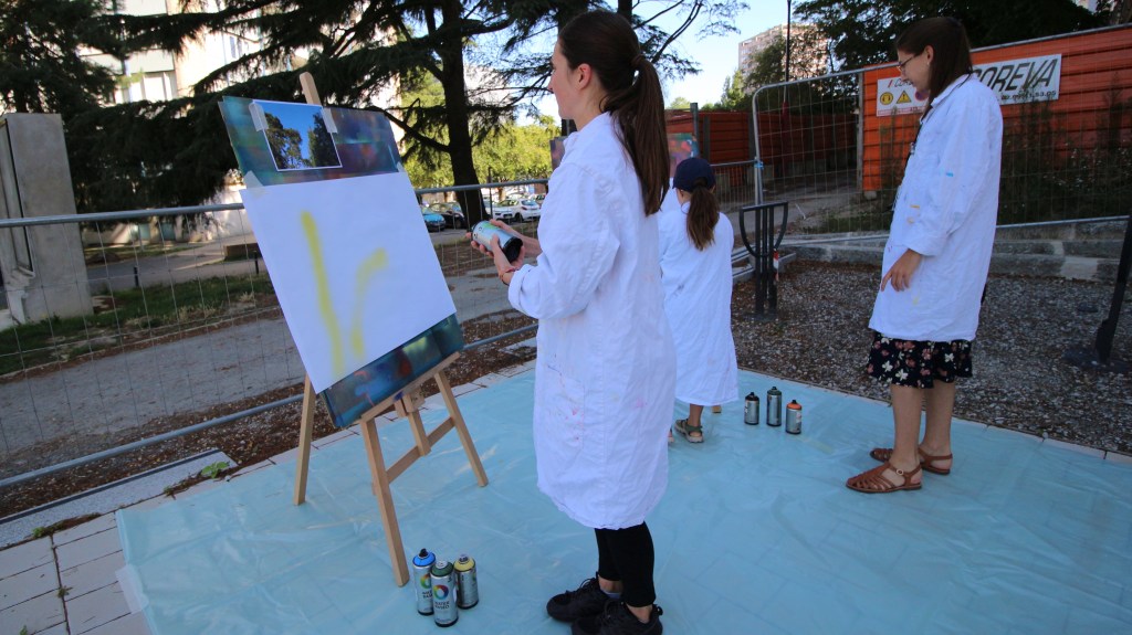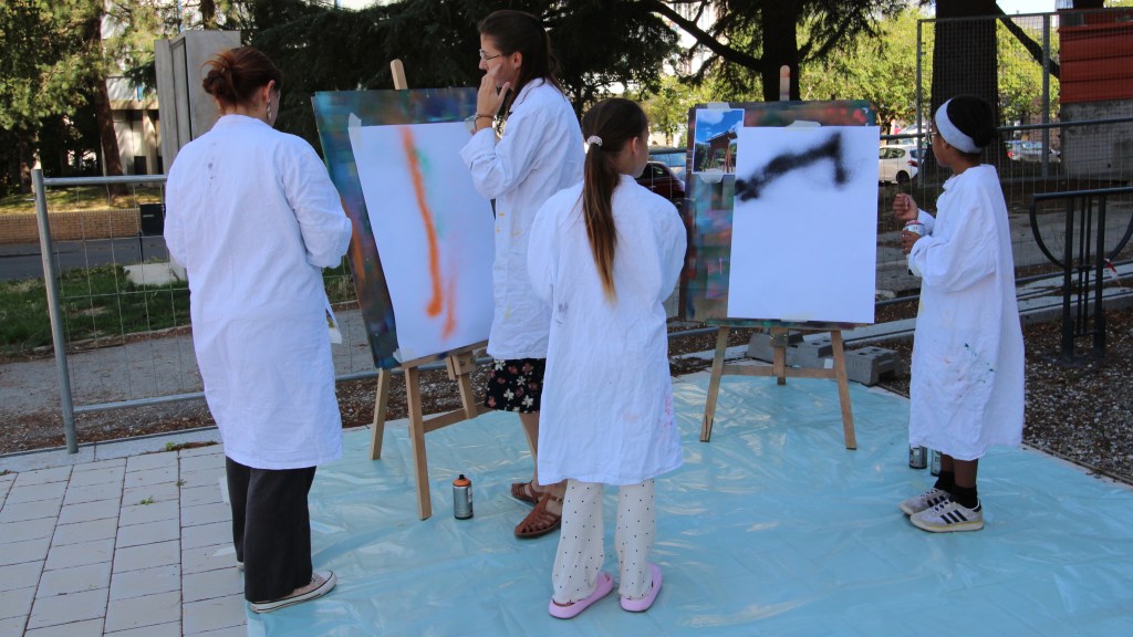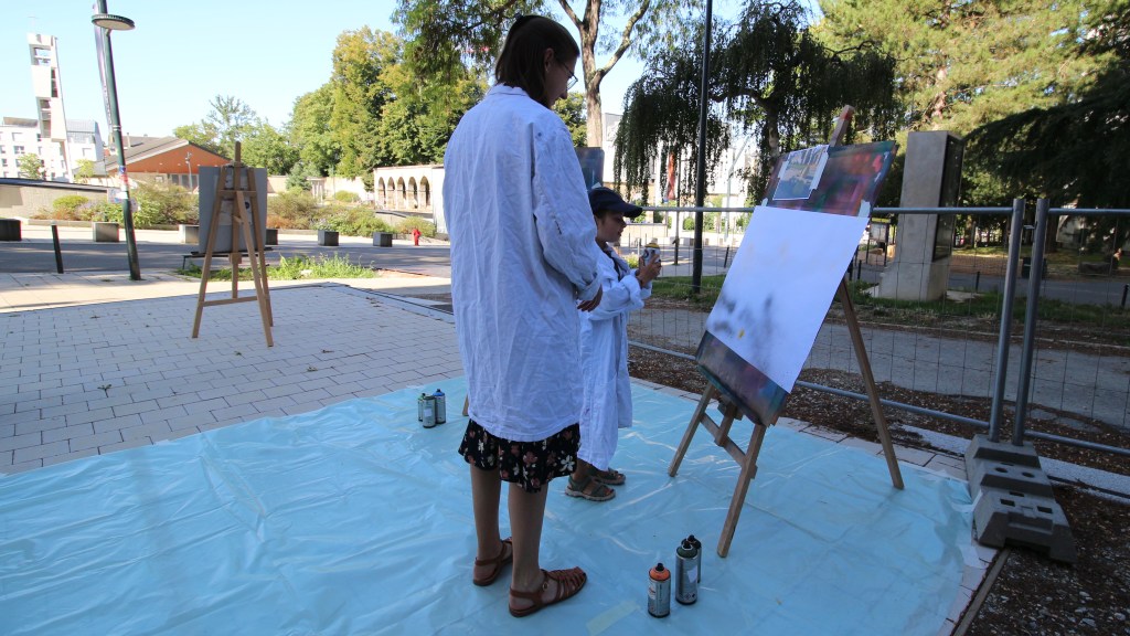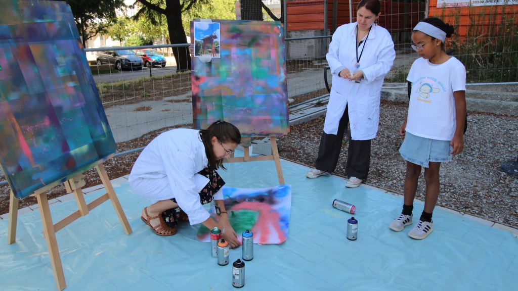Marion, médiatrice du Musée des Beaux-Arts de Maurepas, explique un exercice créatif de peinture à la bombe