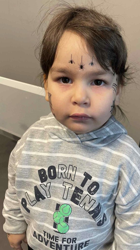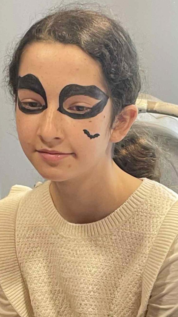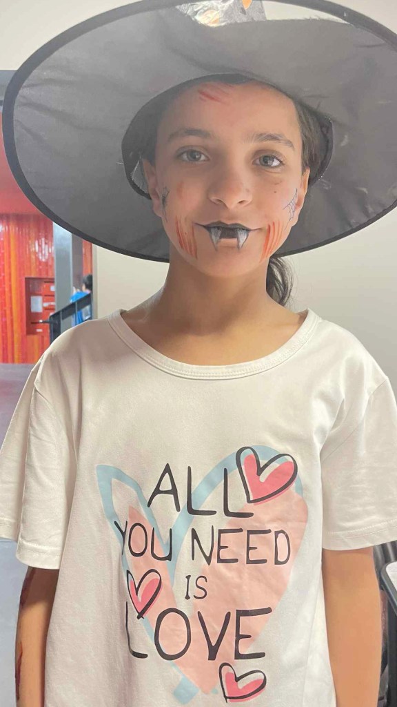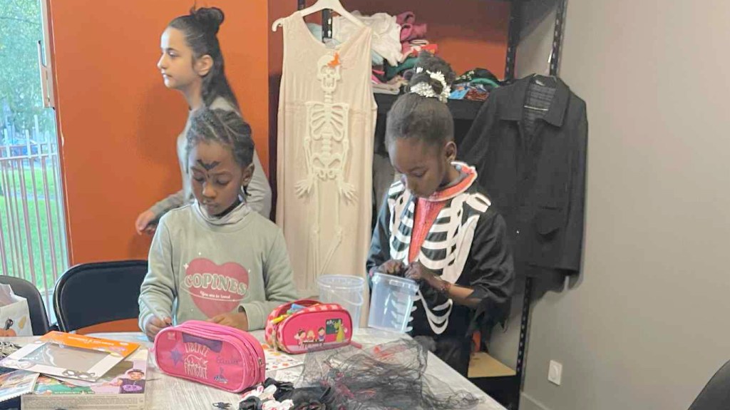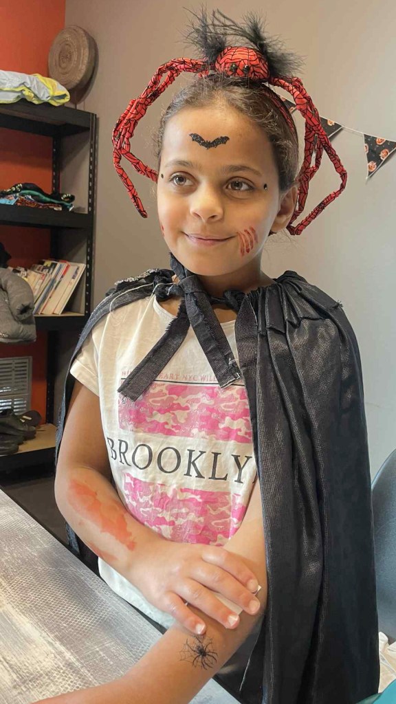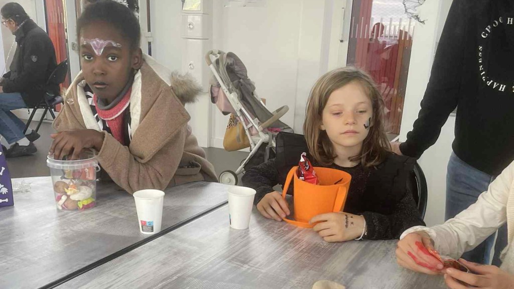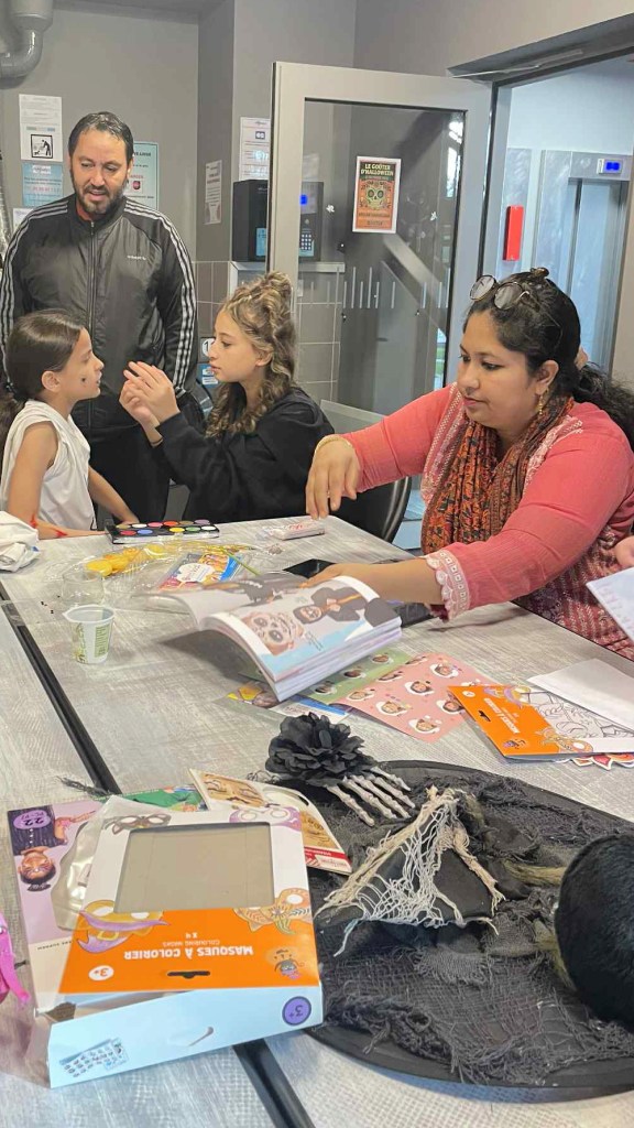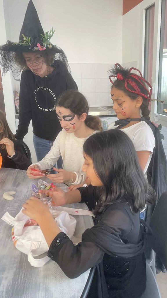 Pour Halloween, les habitants de la Tour Guérande se sont retrouvés dans la buanderie, au rez-de-chaussée, pour se costumer et nous maquiller. Parvin et les grandes sœurs de Rama et Rahaf ont maquillé les enfants. Charlotte s’est occupée des tatouages, Chantal des costumes et Laurette des masques.