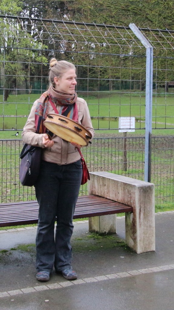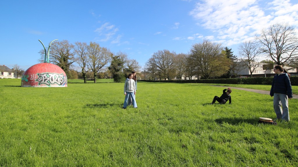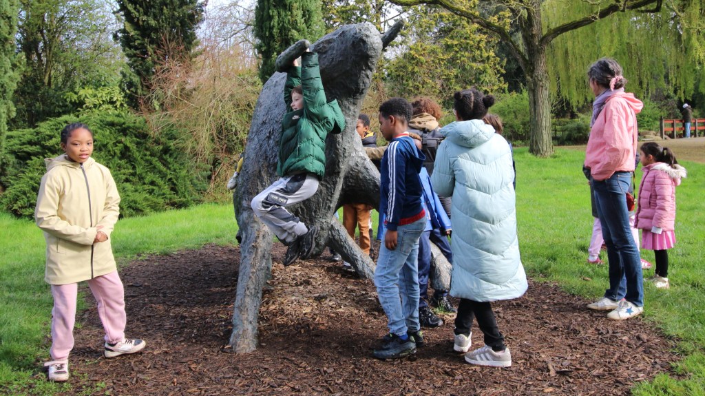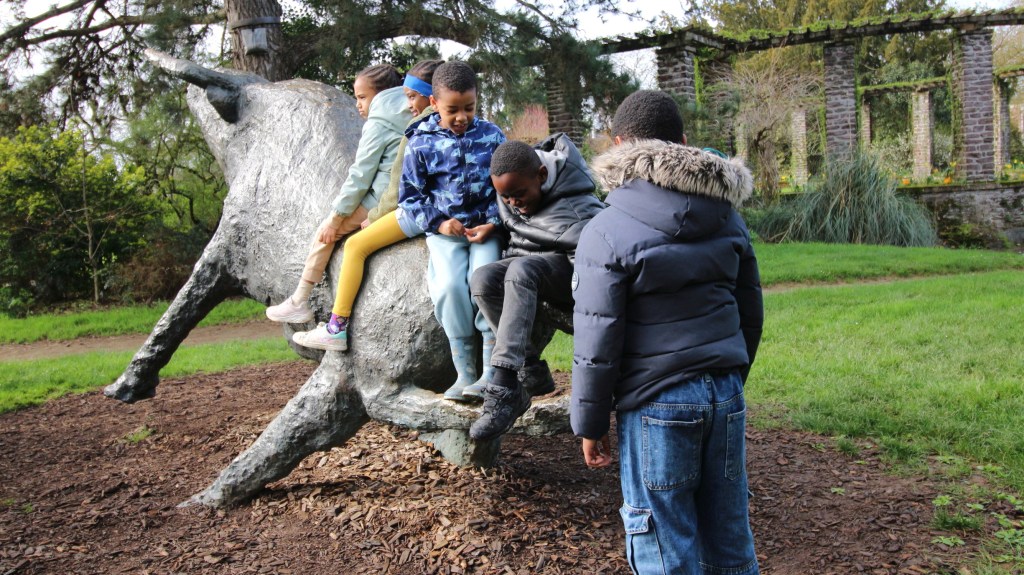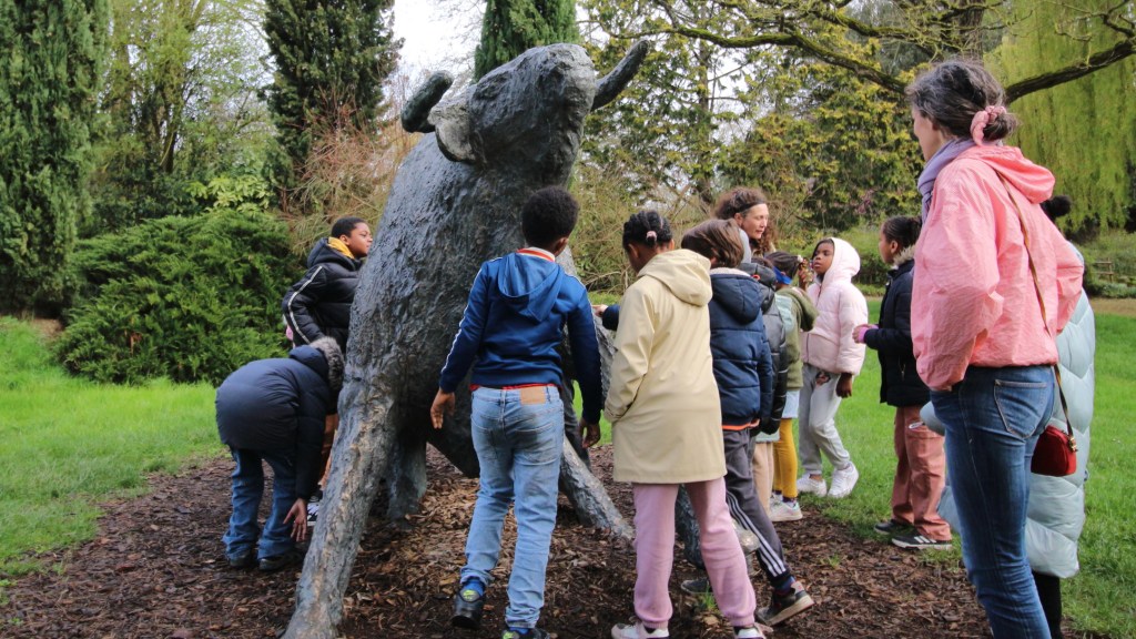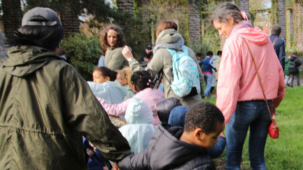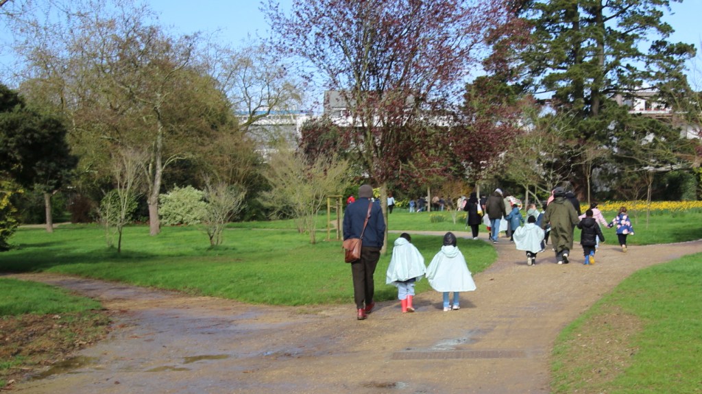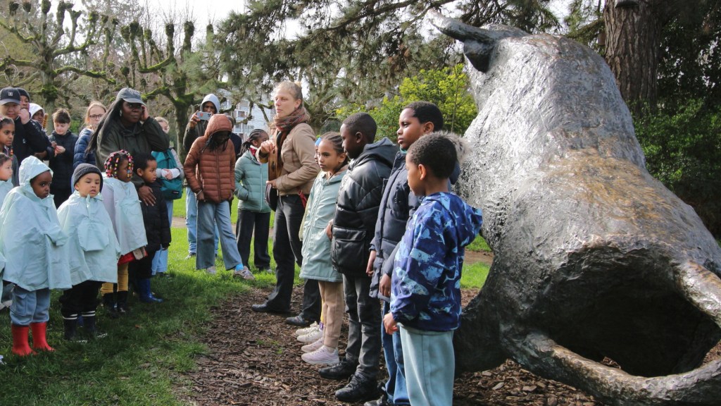 La deuxième partie de la balade contée début au Parc de Maurepas. une classe de CE2 de l’école des Gayeulles a écrit et raconté une histoire autour du Taureau de Maurepas : il a bu l’eau de la rivière sans savoir qu’elle était empoisonnée. Il devient fou et met le bazar dans tour le parc.